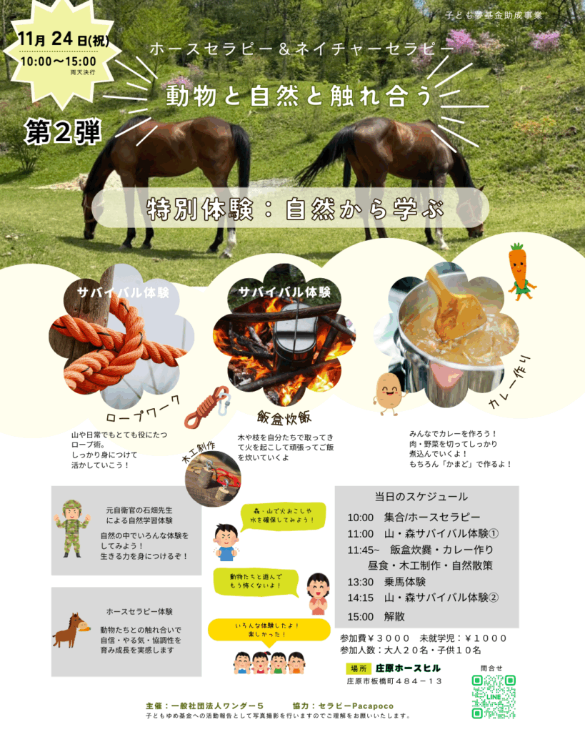 2025年11月18日 / 最終更新日時 : 2025年11月18日 wonder5 お知らせ 第2弾/サバイバル☆ホースセラピー! 〜満員となりました〜 \ 最新情報をチェック / コメントを残す コメントをキャンセルメールアドレスが公開されることはありません。 ※ が付いている欄は必須項目ですコメント ※ 名前 ※ メール ※ サイト 次回のコメントで使用するためブラウザーに自分の名前、メールアドレス、サイトを保存する。 上に表示された文字を入力してください。 Δ